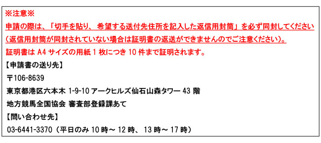 ■証明書は、地方競馬全国協会が発行する様式で作成します。申請書に記入された年度に登録されていた全ての競走馬について、その登録期間、出走回数等を証明します。 その年に5頭以上保有している方は、1年間のみの申請で結構ですが、保有頭数が5頭に満たない方は、過去3年間の申請が必要となります。 但し、証明書は3年間分ごとの発行となります。