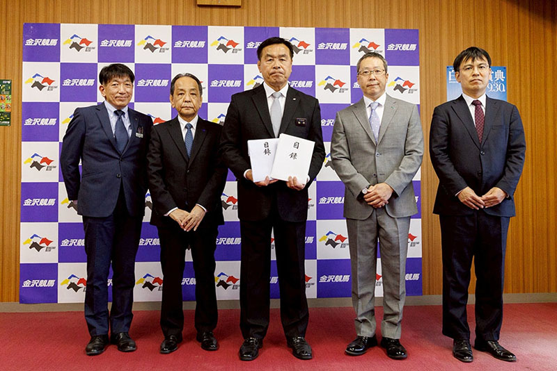 全国公営競馬主催者協議会ならびに地方競馬全国協会は9月30日(火)、8月7日の集中豪雨により浸水被害に見舞われた金沢競馬に対し、見舞金を贈呈しました。 馳浩石川県知事(写真左)に目録を渡すNAR斉藤理事長 関係者による記念撮影