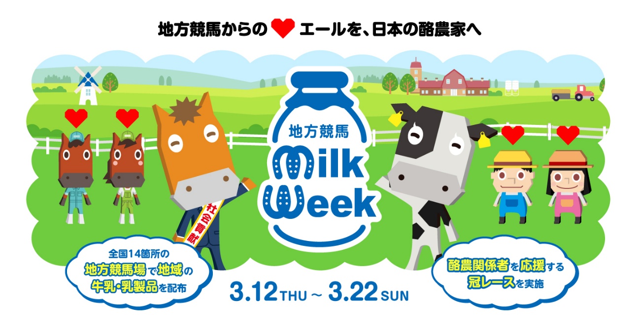 馬事畜産振興協議会は、春休みに入り需要が落ち込む牛乳・乳製品の消費拡大の一助となるべく、昨年に引き続き「地方競馬ミルクウィーク2026」を地方競馬全国協会の補助を受け実施します。期間中は、全国14の地方競馬場で地域の牛乳・ヨーグルト等の乳製品の配布や冠レースを実施し、牛乳・乳製品の消費拡大につながるPR活動を通じて日本の酪農を応援していきます。